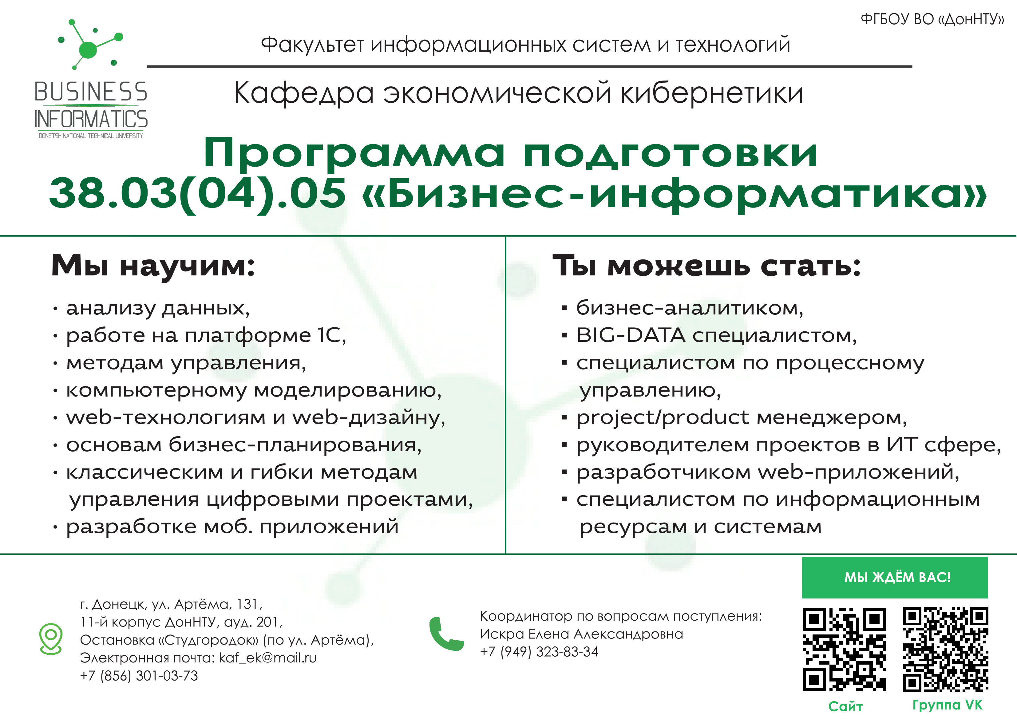 Кафедра «Экономическая кибернетика» осуществляет подготовку бакалавров по современному направлению подготовки «БИЗНЕС-ИНФОРМАТИКА», профили: