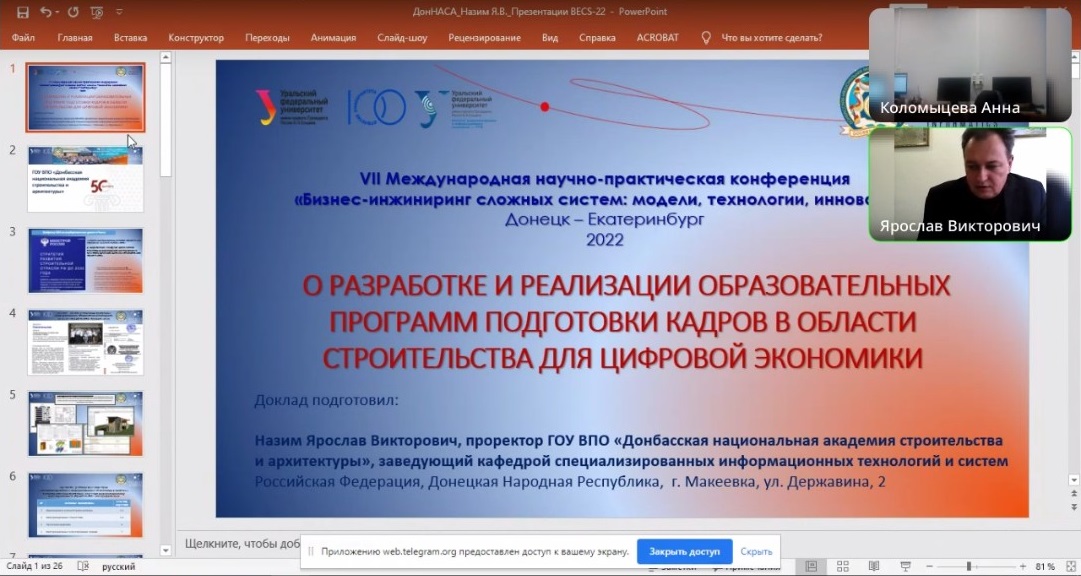 11 – 12 ноября ГОУВПО «Донецкий национальный технический университет» и ФГАОУ ВО «Уральский федеральный университет имени первого Президента России Б.Н. Ельцина» совместно провели VII Международную научно-практическую конференцию «БИЗНЕС-ИНЖИНИРИНГ СЛОЖНЫХ СИСТЕМ: МОДЕЛИ, ТЕХНОЛОГИИ, ИННОВАЦИИ – BECS-2022».